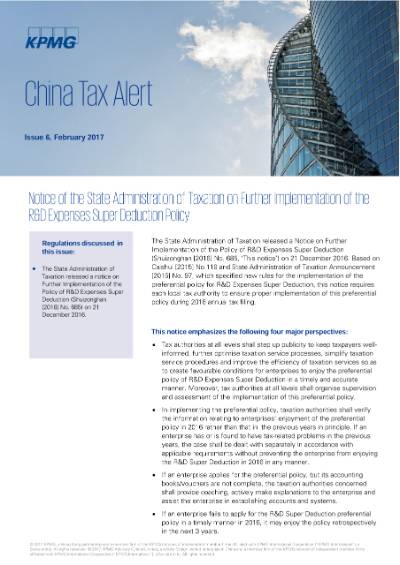 The State Administration of Taxation released a Notice on Further Implementation of the Policy of R&D Expenses Super Deduction (Shuizonghan [2016] No. 685, 'This notice') on 21st of December 2016. This notice requires each local tax authority to ensure proper implementation of this preferential policy during the 2016 annual tax filing. No. 685 clarifies that if an enterprise has or is found to have tax related problems in the previous years, the case shall be dealt with separately in accordance with applicable requirements without preventing the enterprise from enjoying the R&D Super Deduction in 2016 in whatever manner. In addition, if an enterprise fails to apply for enjoying the R&D Super Deduction preferential policy in a timely manner in 2016, it may enjoy the policy retrospectively in the next 3 years.
