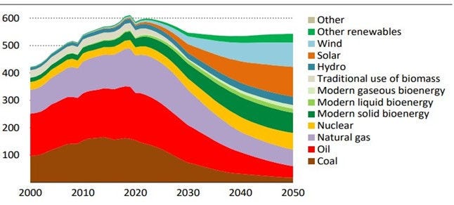 The share of fossil fuels in the total energy mix will fall from 80% in 2020 to just over 20% in 2050. However, their use will not fall to zero in 2050: significant amounts are still used to produce non-energy goods, carbon capture and utilization storage (CCUS – Carbon capture and utilization storage) technologies will be used and in sectors where emissions are particularly difficult to reduce, such as heavy industry and transport. All remaining emissions in 2050 are offset by carbon capture and utilization technologies and climate projects (e.g., carbon sequestration in forest ecosystems). Coal use will fall from 5,250 million tons of coal equivalent in 2020 to 2,500 million tons of coal equivalent in 2030 and to less than 600 million tons in 2050 – an average annual decline estimated at 7% per year. Oil demand will fall to 72 million barrels per day in 2030 and 24 million barrels per day in 2050 - an average annual decline of more than 4% through 2050. Natural gas use peaks in the mid-2020s and then begins to decline as it is phased out in the power sector. Natural gas use declines to 3,700 billion m3 in 2030 and 1,750 billion m3 in 2050 - an average annual decline of just under 3% per year.