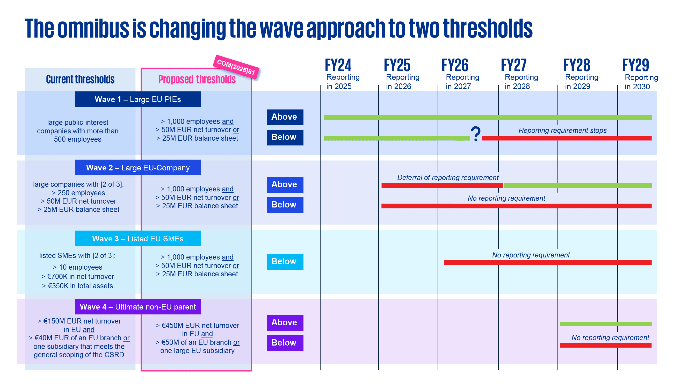 - Postponement of reporting requirements: The package proposes a two-year delay in the implementation of reporting requirements for large companies yet to start implementing the CSRD and for listed SMEs (Waves 2 and 3). This extension aims to provide co-legislators with time to agree on the proposed substantive changes.