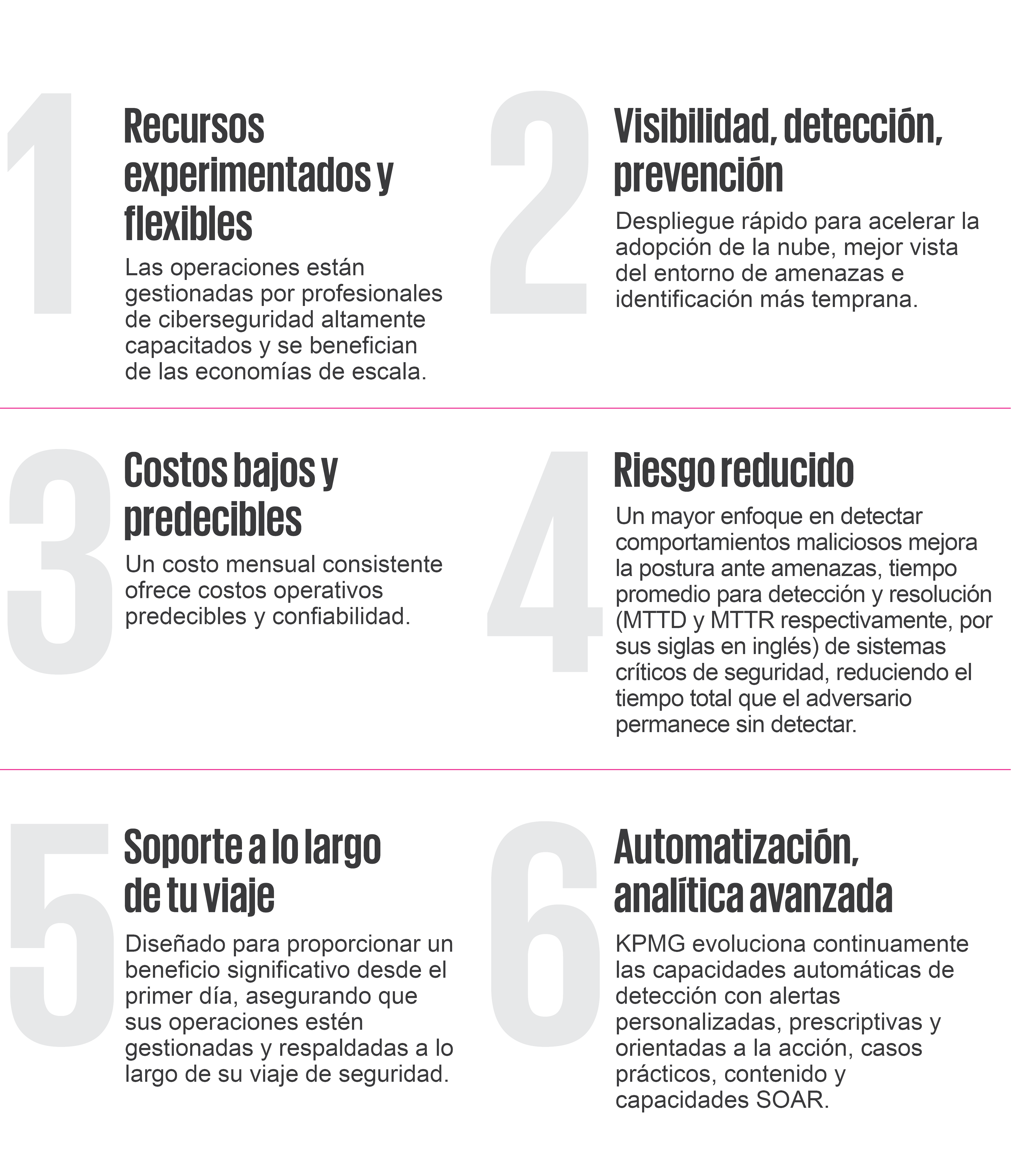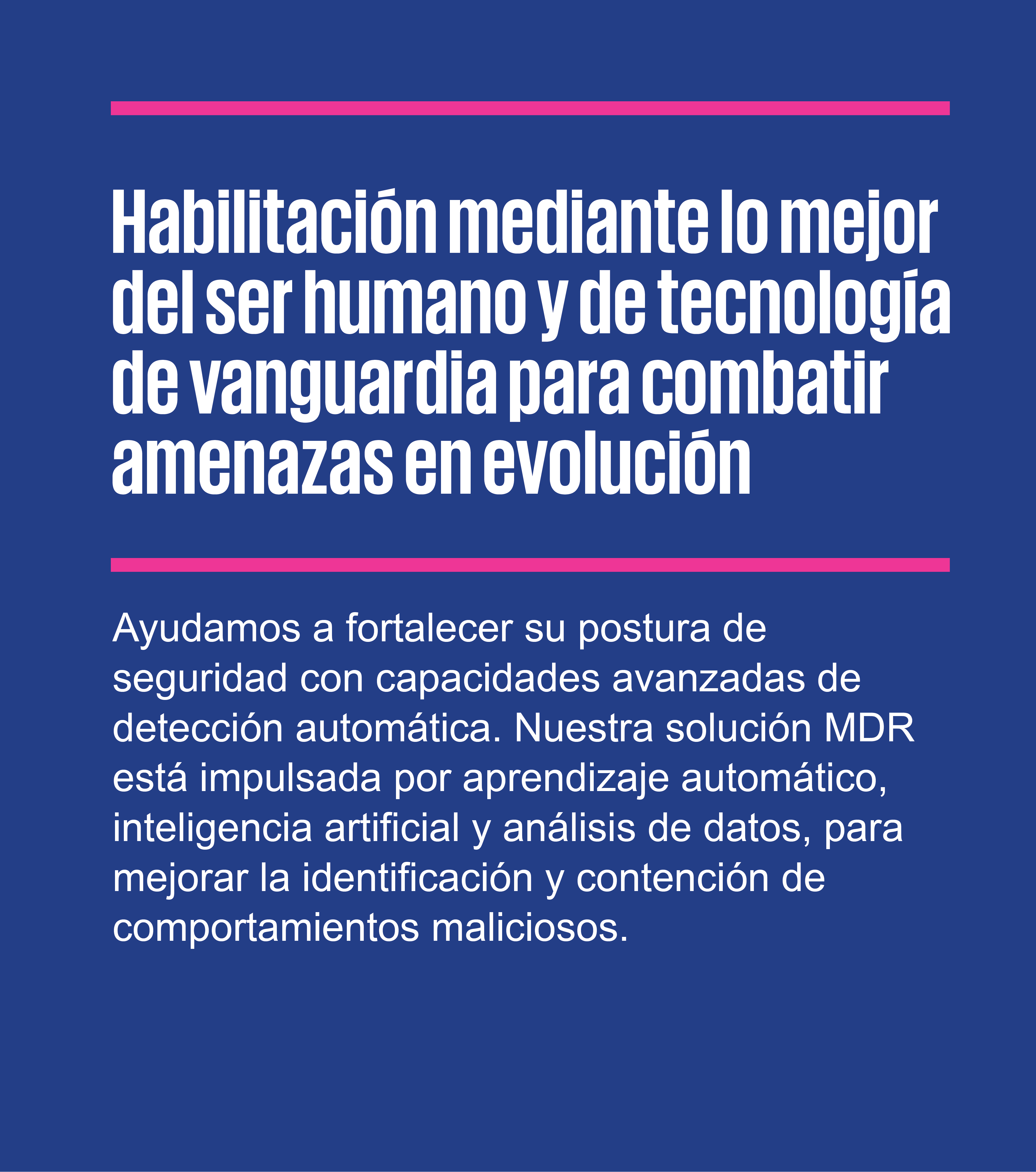La solución de Detección y Respuesta Gestionada (MDR, por sus siglas en inglés) de KPMG detecta, responde y contiene amenazas de manera proactiva, efectiva y eficiente, proporcionándole los recursos de seguridad, la tecnología y las perspectivas relevantes cómo y cuándo las necesita. Ofrecemos servicios gestionados a su medida para lograr el mejor resultado posible en cuanto a la detección de amenazas, haciendo recomendaciones continuas a medida que cambian las necesidades de su negocio. Este enfoque aprovecha nuestro profundo conocimiento y experiencia, combinado con tecnología líder, para proporcionar resultados medibles y escalables a través de técnicas innovadoras como el monitoreo continuo, la búsqueda proactiva y la inteligencia de amenazas. Una brecha de seguridad con duración por debajo de 200 días cuesta $1 millón USD menos que aquella con más de 200 días de duración.