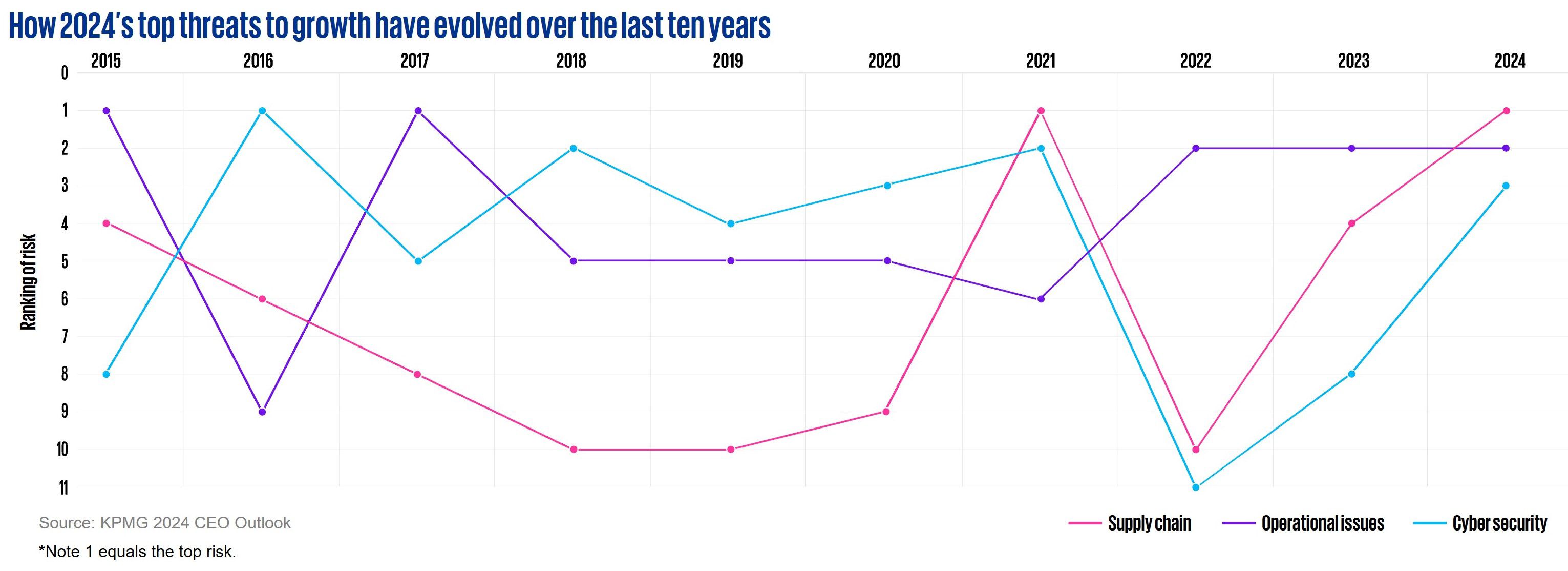 The economic landscape has evolved significantly over the past decade. In 2021, supply chain disruptions, largely driven by the COVID-19 pandemic, were viewed as a major threat to business growth. Remarkably, three years later, supply chain challenges remain at the forefront of CEOs’ concerns. This year's CEO Outlook survey shows a shift in perceived threats to growth, with supply chain challenges and operational issues now coming in above cybersecurity and even last year’s top concern—geopolitics and political uncertainty.