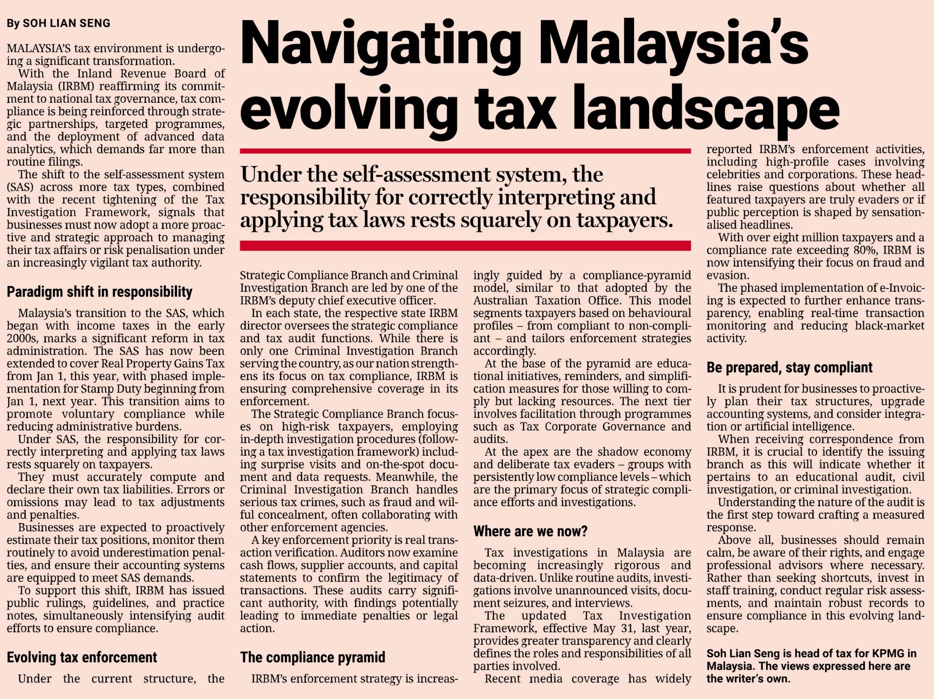 In this commentary, Soh Lian Seng, Head of Tax at KPMG in Malaysia, outlined how businesses must adapt to the expanding Self-Assessment System (SAS), intensifying enforcement and increasing reliance on data analytics. He highlighted the need for proactive tax governance, system readiness and strategic compliance, especially amid intensifying tax scrutiny.