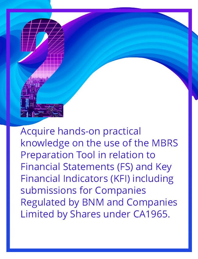 MBRS2.0 Financial Statements Training sessions are especially designed for company secretarial and finance personnel who are tasked with the responsibilities of MBRS Financial Statements submission, providing these accelerated learning outcomes: