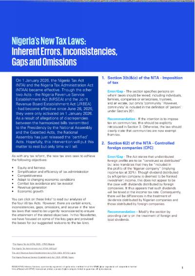 On 1 January 2026, the Nigeria Tax Act (NTA) and the Nigeria Tax Administration Act (NTAA) became effective. Though the other two Acts - the Nigeria Revenue Service Establishment Act (NRSEA) and the Joint Revenue Board Establishment Act (JRBEA) - had become effective since June 26, 2025, they were only activated on 1 January 2026.