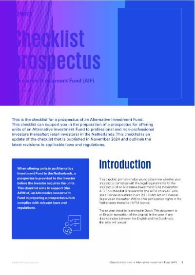 On this page you can download the checklist for the prospectus of an Alternative Investment Fund. This checklist can support you in the preparation of a prospectus for offering units to investors in the Netherlands. This checklist is an update of the checklist that was published in November 2024 and outlines the latest revisions in applicable laws and regulations as of November 2025.