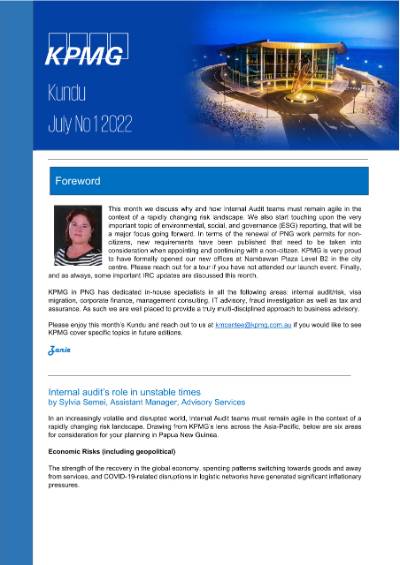 This month we discuss why and how Internal Audit teams must remain agile in the context of a rapidly changing risk landscape. We also start touching upon the very important topic of environmental, social, and governance (ESG) reporting, that will be a major focus going forward. In terms of the renewal of PNG work permits for non-citizens, new requirements have been published that need to be taken into consideration when appointing and continuing with a non-citizen. KPMG is very proud to have formally opened our new offices at Nambawan Plaza Level B2 in the city centre. Please reach out for a tour if you have not attended our launch event. Finally, and as always, some important IRC updates are discussed this month.