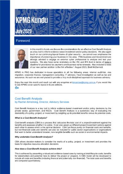 In this month’s Kundu we discuss the considerations for an effective Cost Benefit Analysis as a key tool to inform evidence-based investment and/or policy decisions. We also again touch on our continuing topical theme of cyber security – we cannot over emphasise the importance of protecting your business in this area. PNG business and Government are strongly advised to engage an external cyber professional to analyse and test your systems. We also have some reminders on the IRC and IPA front in terms of today’s deadline for provisional tax payments and business name renewals. Also included is news of our new partner addition to the firm effective 1 August 2023, Brett McDermott.