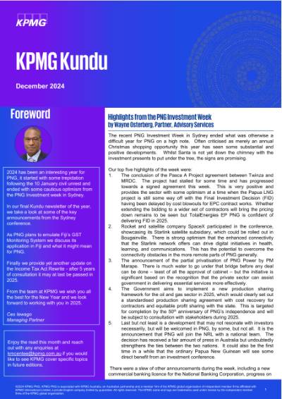 As usual, you may access our regular multi-disciplined thought leadership pieces, newsletters, and updates on our KPMG PNG LinkedIn page.