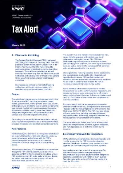 The Federal Board of Revenue (FBR) has issued SRO 288(I)/2026 dated 18 February 2026. The SRO publishes a draft substitution of Chapter VIIA of the Income Tax Rules, 2002 (the Rules) for public comments related to electronic invoicing by notified taxpayers. The draft is not yet effective and will become enforceable only after the FBR issues a final notification and subsequently an Income Tax General Order specifying implementation timelines and modalities.
