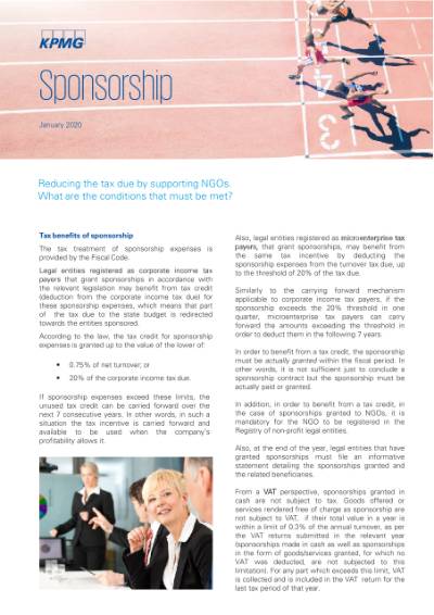 The tax treatment of sponsorship expenses is provided by the Fiscal Code. Legal entities registered as corporate income tax payers that grant sponsorships in accordance with the relevant legislation may benefit from tax credit (deduction from the corporate income tax due) for these sponsorship expenses, which means that part of the tax due to the state budget is redirected towards the entities sponsored.
