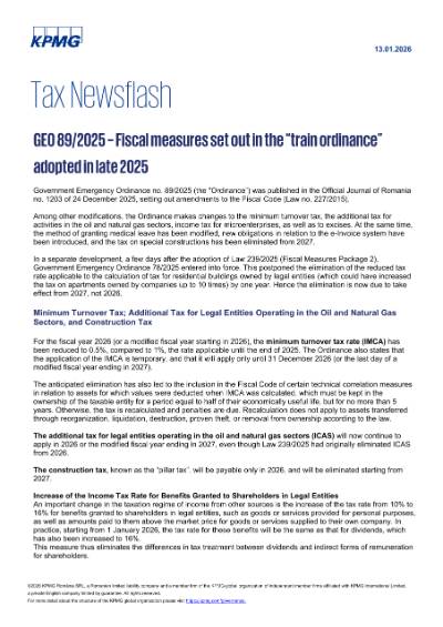 Government Emergency Ordinance no. 89/2025 (the “Ordinance”) was published in the Official Journal of Romania no. 1203 of 24 December 2025, setting out amendments to the Fiscal Code (Law no. 227/2015).