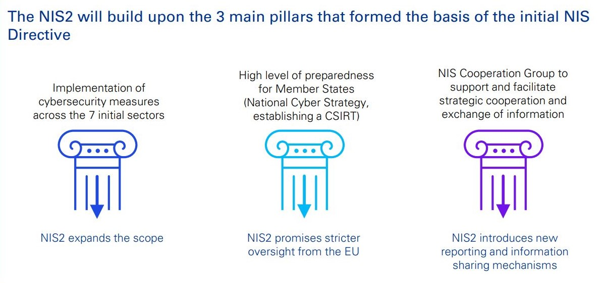 NIS1 har sedan tidigare ställt krav på ett systematiskt och riskbaserat informationssäkerhetsarbete som minst motsvarar den internationella standarden ISO 27001 och ISO 27002. NIS2 har tydligare inriktning mot förebyggande säkerhetsarbete där behovet av processer för riskbedömningar och incidentberedskap förstärks. Direktivet ställer också högre krav på ledningens engagemang och utvecklade strategier för styrning och ledning. För att möta NIS2 och den kommande cybersäkerhetslagen måste organisationer anpassa sin digitala infrastruktur, sina arbetssätt och styrkedjor.