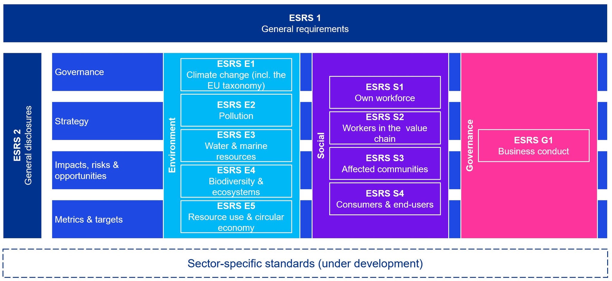 EFRAG (the European Financial Reporting Advisory Group) is in charge of drafting the ESRS. So far, twelve sector-agnostic standards have been adopted. Two of these are overarching standards and ten of them are thematic standards. The ESRS lays down details regarding the requirements within CSRD and encompasses: