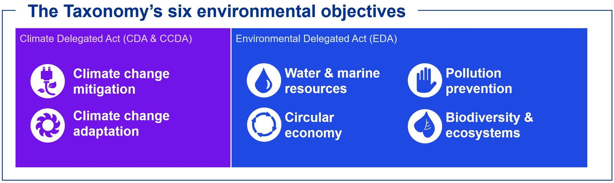 - Environmental Delegated Act (EDA) which includes technical screening criteria for economic activities related to the remaining four environmental objectives.