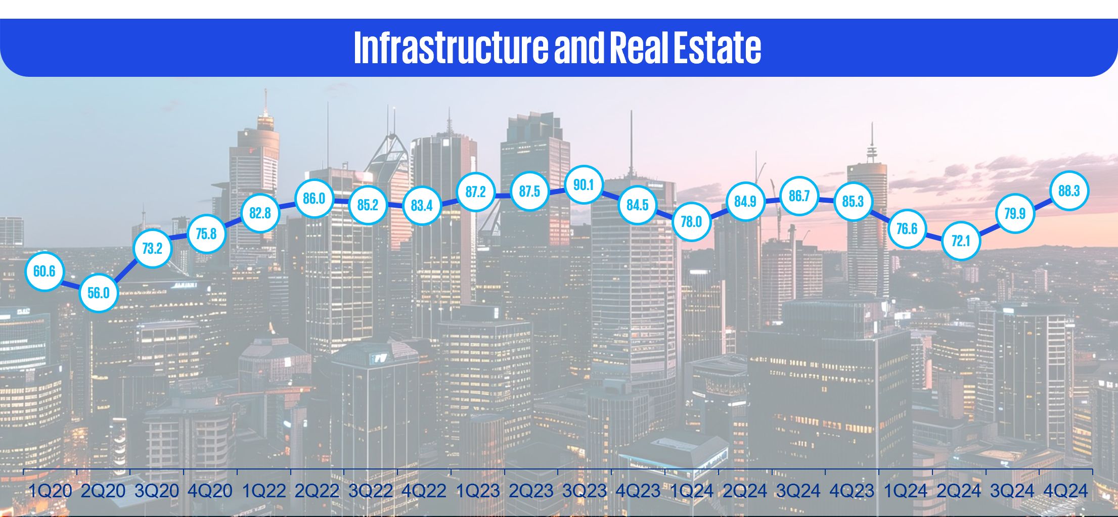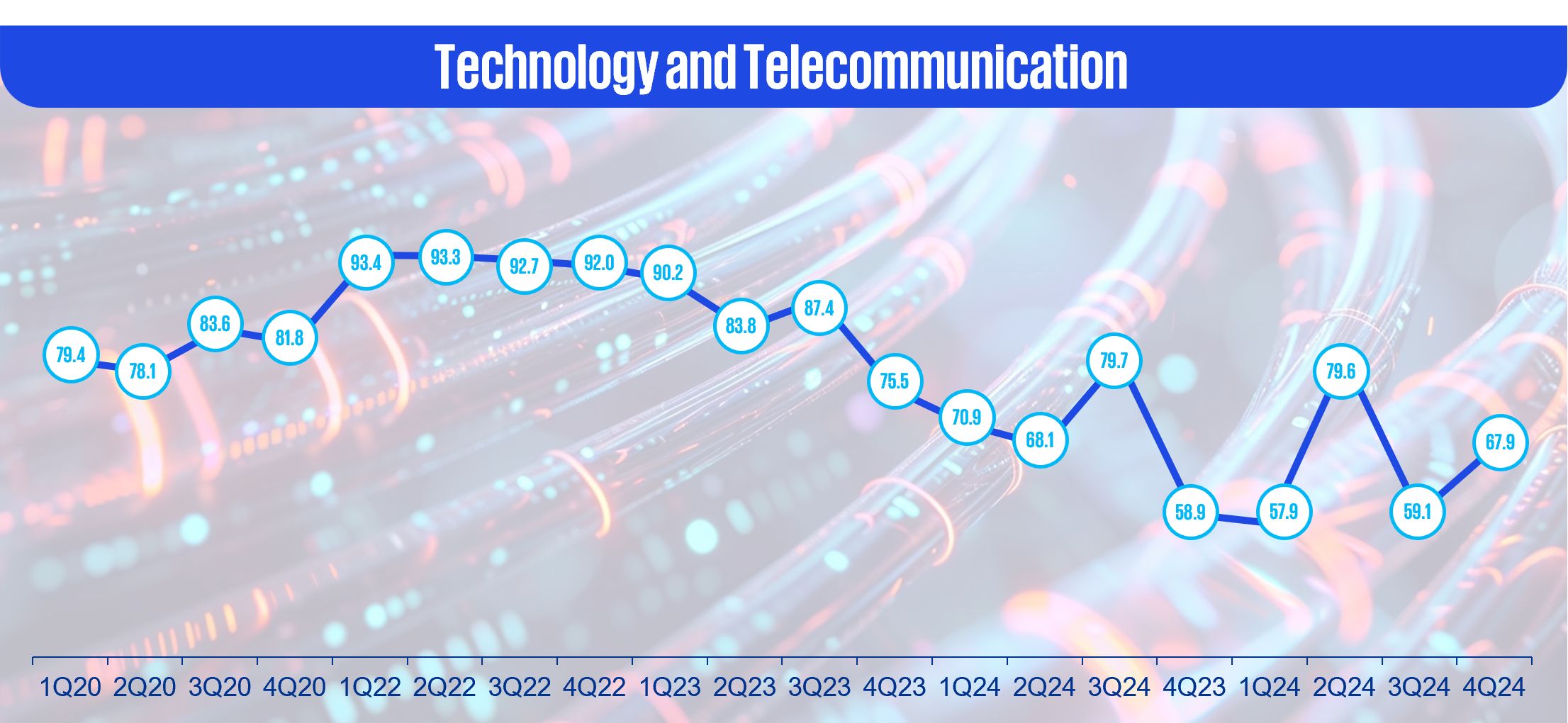 - The FPI score for the Manufacturing sector rose from 58.2 in 3Q24 to 82.4 in 4Q24, driven primarily by the Industrial Manufacturing sub-sector. Growth in electronics clusters of manufacturing sector and machinery was robust due to the global electronics cycle upturn. Despite expected increases in production costs due to trade frictions and geopolitical conflicts, the sector is projected to continue growing in 2025.