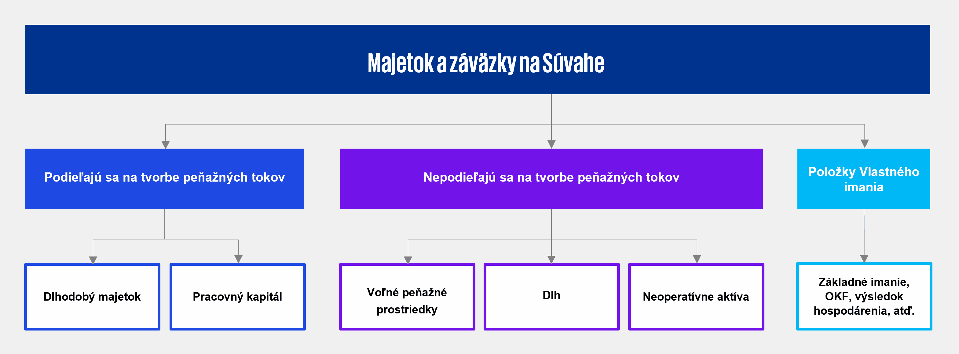 Pri štandardnom výnosovom ocenení je hodnota spoločnosti, zjednodušene povedané, súčtom peňažných tokov, ktoré dokáže v budúcnosti vyprodukovať. Tieto peňažné toky vznikajú využívaním dlhodobého majetku, prácou zamestnancov a obchodovaním so zákazníkmi či dodávateľmi. S týmito činnosťami sú úzko prepojené majetok, pohľadávky a záväzky, ktoré spoločnosti pomáhajú generovať tieto peňažné toky – a preto sú neoddeliteľnou súčasťou jej hodnoty. Vo všeobecnosti ich delíme na dlhodobý majetok a pracovný kapitál.