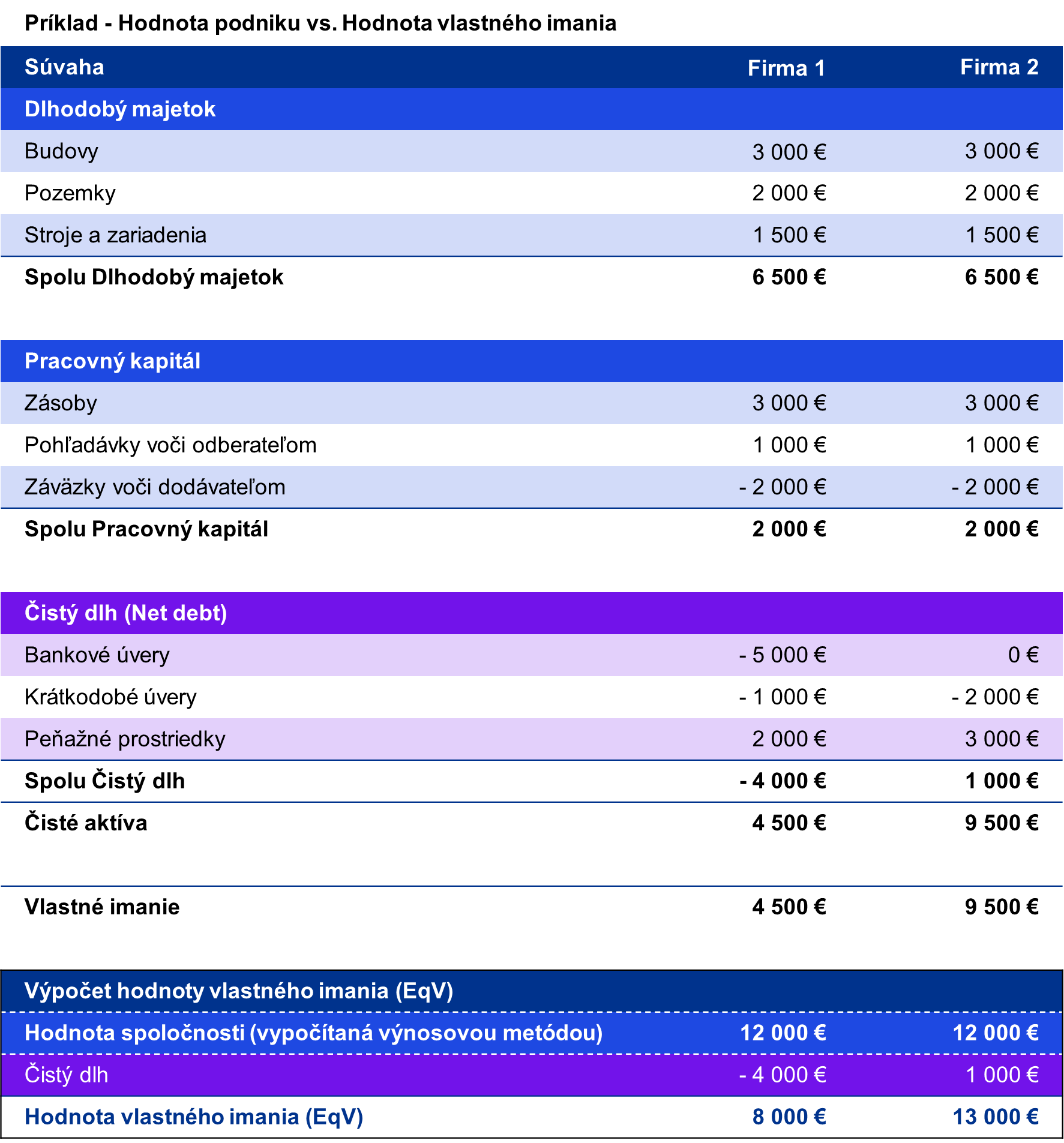 Dve spoločnosti môžu mať rovnakú hodnotu podniku (hodnotu aktív po odpočítaní hotovosti), no rozdielnu hodnotu vlastného imania. Firma 1 má vyšší podiel dlhu a nižšie peňažné prostriedky, čo znižuje hodnotu jej vlastného imania. To znamená, že akcionárom by vo Firme 1 pripadla menšia hodnota, a preto by sme za podiel v tejto firme zaplatili menej v porovnaní s Firmou 2.
