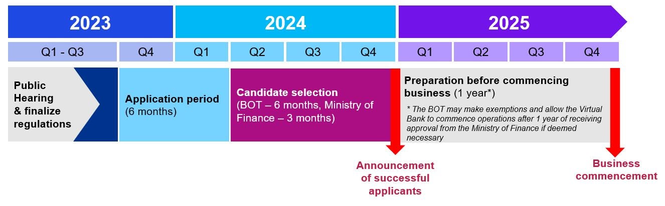 The Virtual Bank applications will likely open in Q4 of 2023, based on recent announcements by the BoT and the selected three candidates will be submitted to the Minister of Finance for final approval of license granting, which should be announced (tentatively) within 2024.