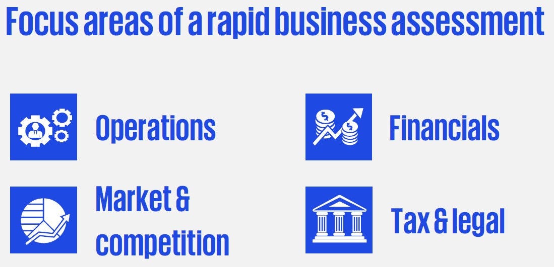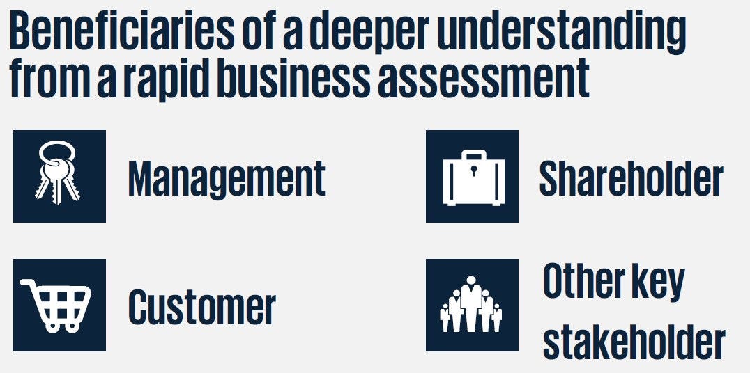 A rapid business assessment can help identify potential risks before they materialize and impact performance. This type of assessment can also be used to identify value creation opportunities that can improve performance and make the business more resilient against external adverse influences.
