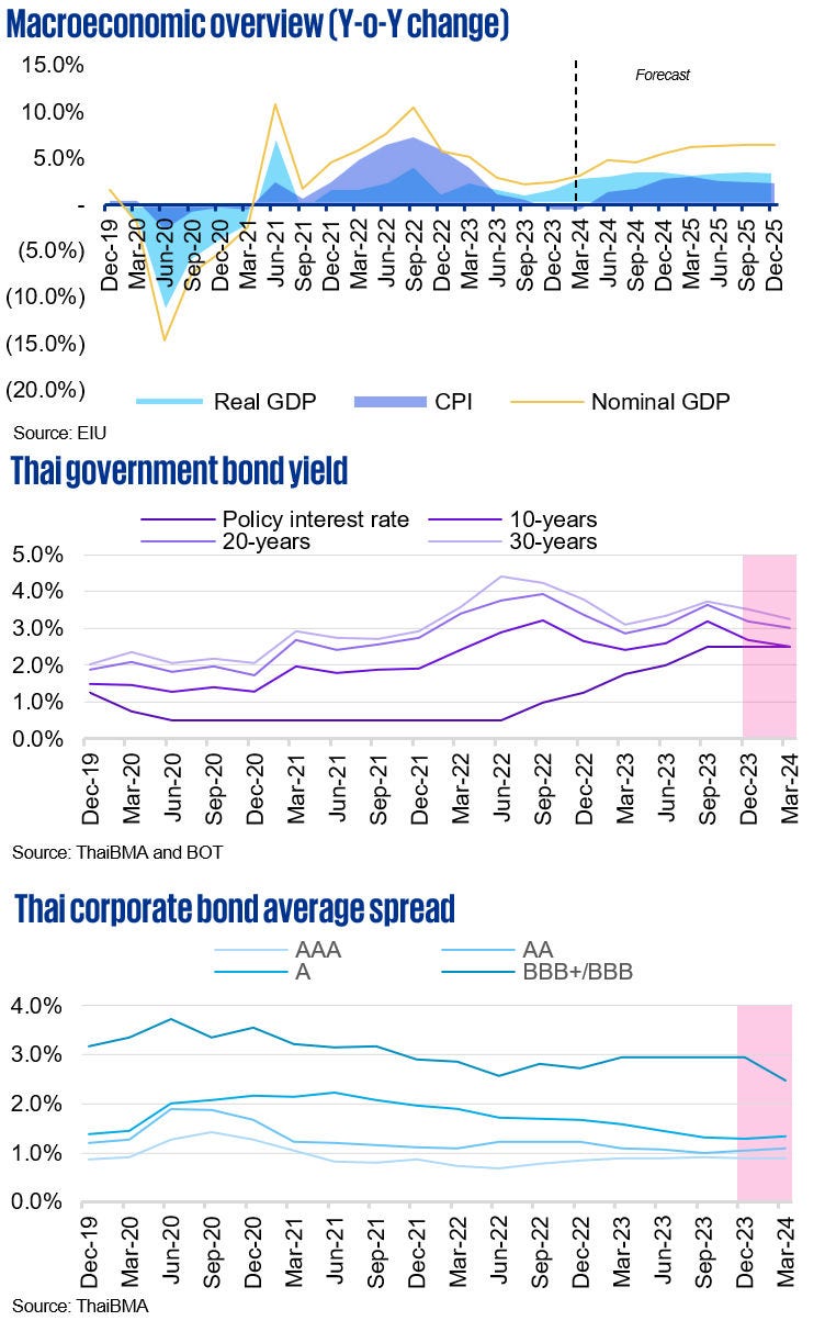 - Inflation: Thai headline inflation is expected to reach the target range of 1.0% to 3.0% by the end of 2024. Headline inflation is projected at 0.6% and 1.3% in 2024 and 2025, respectively. The effect of geopolitical tensions and government subsidies on energy prices are key factors to be monitored.