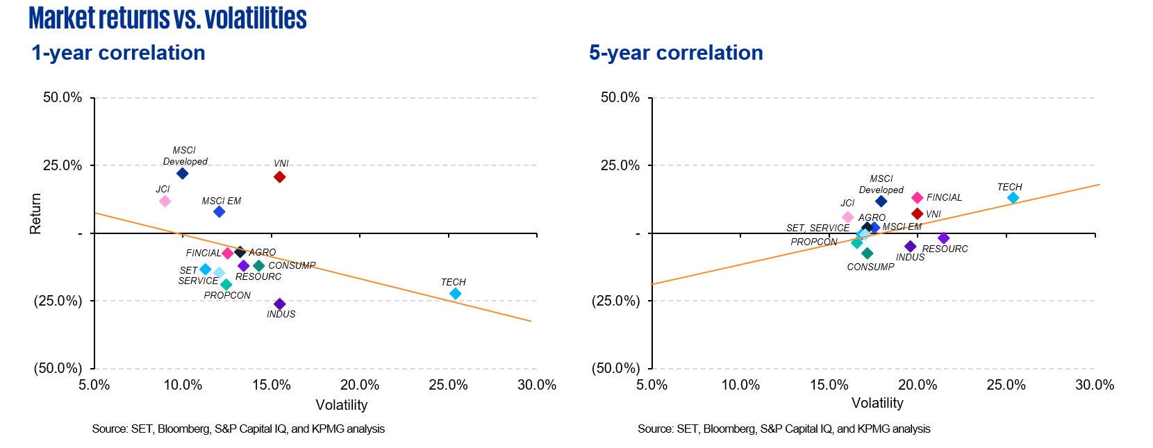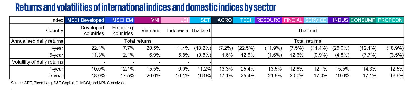 - The SET lagged behind all other illustrated indices over the 1-year and 5-year observation periods. MSCI Developed appeared to have the best performance for both 1-year and 5-year annualised daily returns. 1-year annualised return of VNI has exceeded 20.0%, comparable to the return of MSCI Developed. JCI had the lowest 1-year and 5-year volatilities among the indices while still outperforming MSCI EM.
