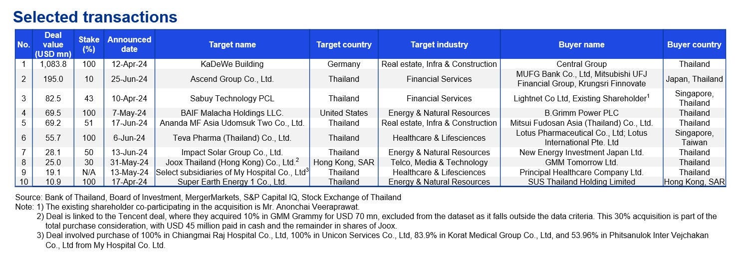 The drop in deal flow can be attributed to a slowdown in outbound deals, signaling a more cautious approach among Thai corporations towards their cross-border inorganic growth strategies. The major deal was Central Group’s estimated USD 1.1 billion acquisition of the KaDeWe building from Austria-based holding company Signa Prime Selection AG. Central Group had previously co-invested with Signa in the KaDeWe Group, which operates three luxury department stores in Germany. While Central Group holds a 50.1% stake in the operating company, Signa remained the sole owner of all property prior to this acquisition. The second largest transaction was the USD 195 million fundraising by MUFG Group to invest in Ascend Group, a Thai-based online payment platform offering notable services such as TrueMoney.