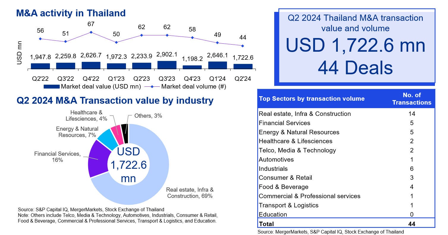 M&A activity in Thailand experienced a downturn in the second quarter of 2024, with a 34.9% decline in deal value to USD 1,722.6 million and a 10.2% decrease in deal volume, amounting to 44 deals, compared with 49 in the previous quarter. Of the 44 deals, 37 were inbound or domestic, representing 31.2% of the total deal value, while 7 outbound deals accounted for 68.8% of the deal value. 22 deals were domestic, unchanged from the previous quarter. The Real Estate, Infra & Construction and Financial Services sectors represented 85.6% of total deal value.