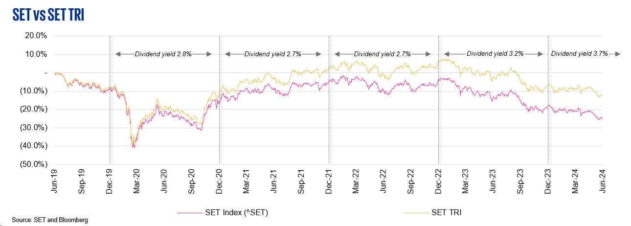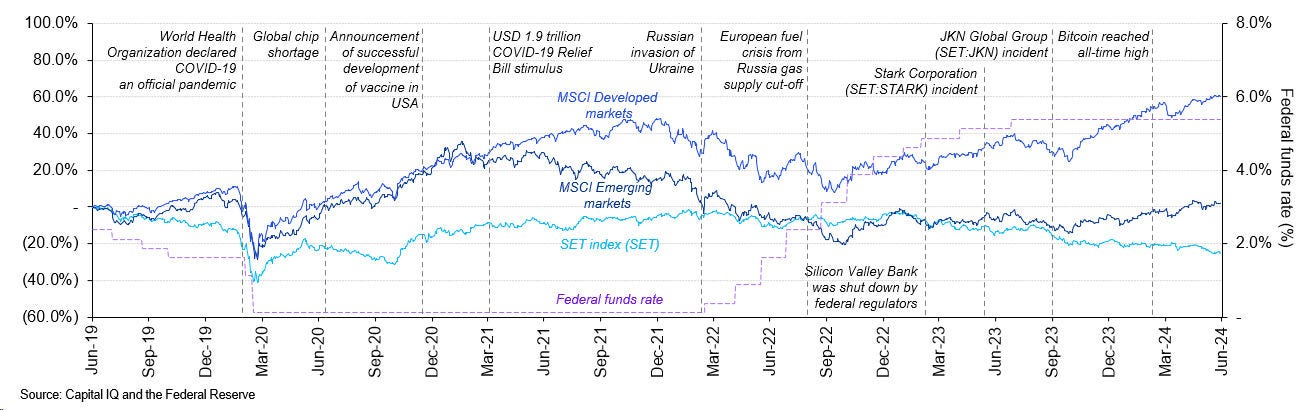 - The Thai capital market (SET Index) has continued its declining trend from the previous quarter, showing a decoupling from the MSCI Developed and Emerging Indices over the last three quarters.