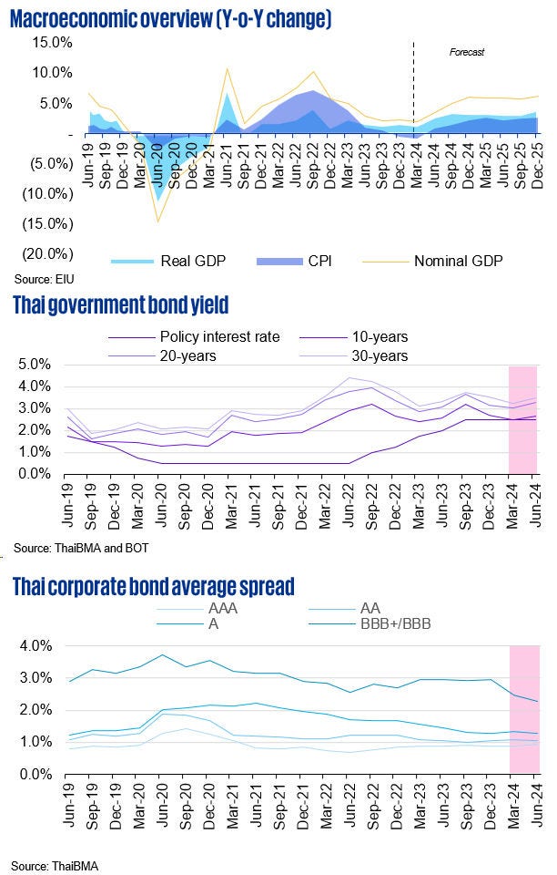 - Inflation: Thai headline inflation is expected to recover to the target range of 1.0% to 3.0% by the end of 2024. Headline inflation is projected at 0.6% and 1.3% in 2024 and 2025, respectively, as the impact of the domestic diesel price subsidy and surplus supply of certain raw food items slowly diminishes.