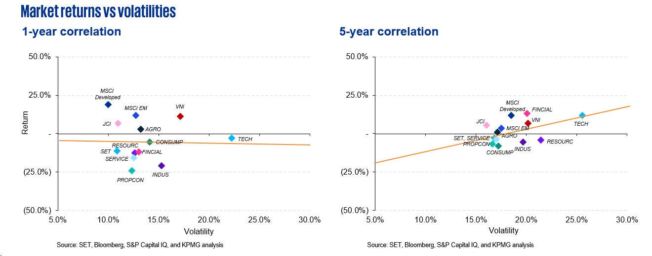 - The SET lagged behind all other illustrated indices over the 1-year and 5-year observation periods. The MSCI Developed recorded the best absolute and volatility-adjusted returns.