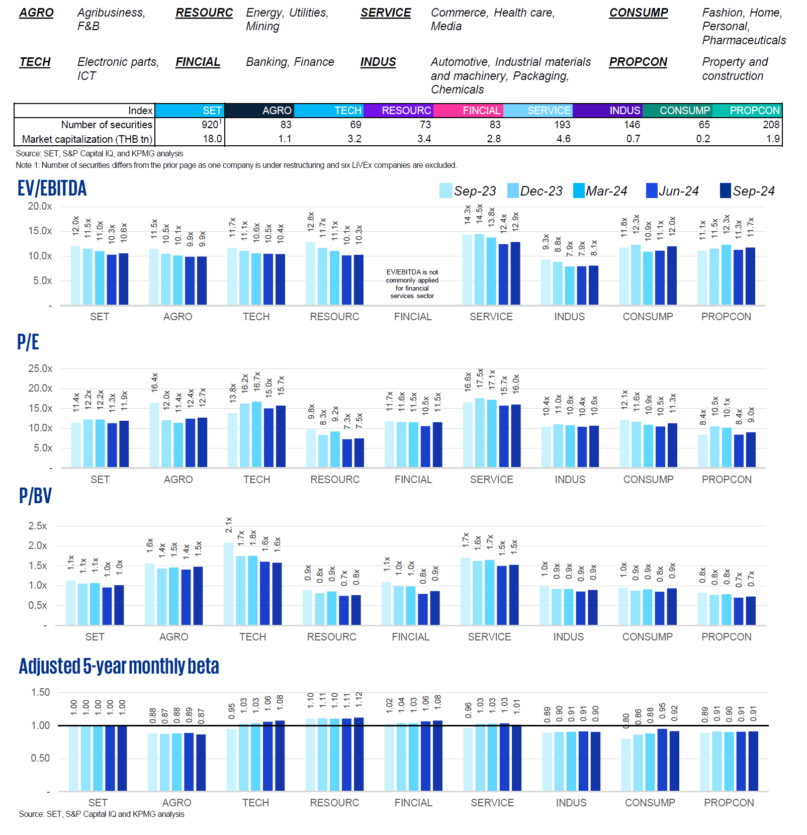The SET has eight key sector categories for listed entities. The three most-common valuation multiples across 5 quarters in these sectors illustrate movement due to both economic fundamentals and the impact of global events on market sentiment.