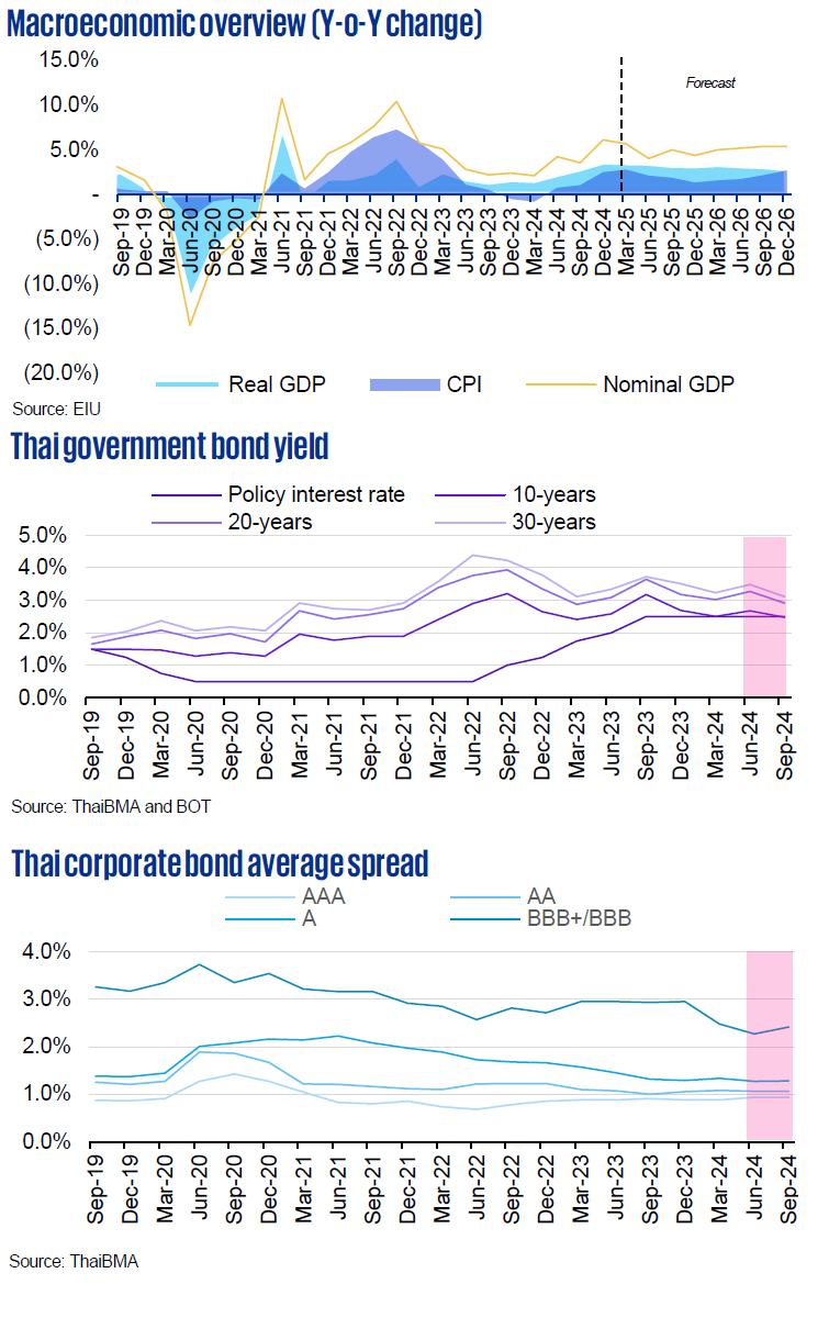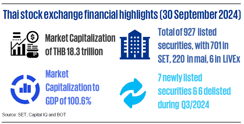 - The Thai capital market (SET Index) recovered from a low of 1,274.0 during the third quarter to 1,448.8 at quarter end, impacted by the introduction of the THB150 billion state investment fund, Vayupak Fund (VAYU1), which drew significant interest from investors.