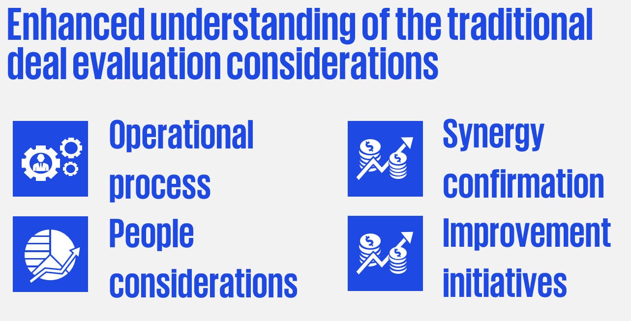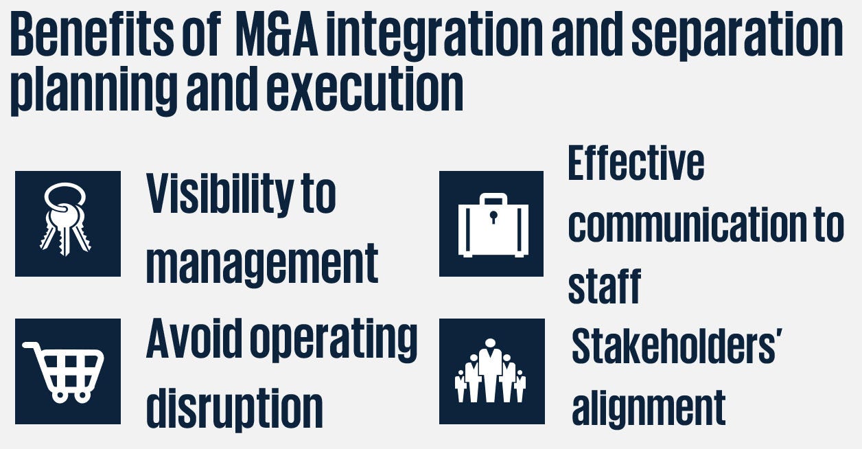 Integration and separation planning and execution provide visibility to management and shareholders. Earlier attention to post-deal integration also enhances transaction evaluation, which includes synergy confirmation, human resource considerations and operational improvement initiatives. Better comprehension of issues in the deal evaluation phase helps businesses to achieve greater value from their M&A deals.