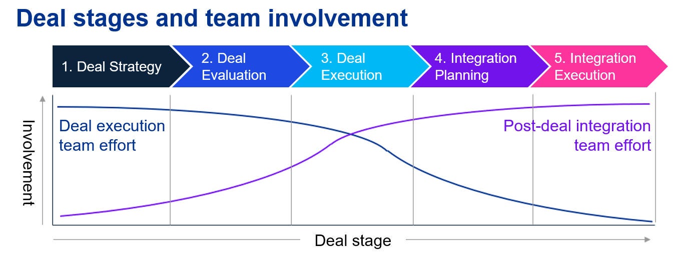 The M&A process requires expertise from various parties, as well as effort from execution and integration teams. For most companies, the business development team handles deal sourcing, transaction evaluation and negotiations until a deal closes, after which a different team manages the post-deal integration.