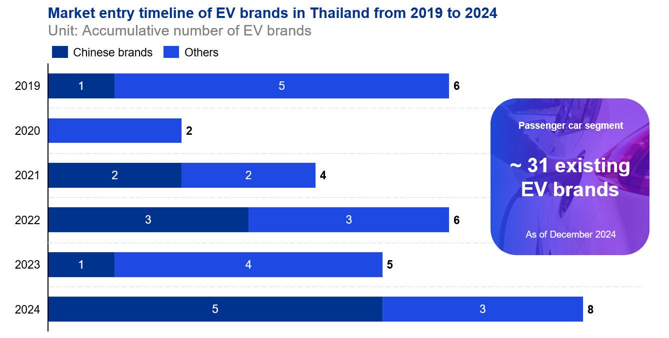Since 2019, there has been an influx of new electric vehicle players entering the Thai market, posing a challenge to incumbent Japanese automakers. These new entrants include Chinese OEMs with a global market presence and advantages in economies of scale and import duty exemptions, making their imported Completely Built-Ups (CBUs) relatively more affordable than domestically produced vehicle counterparts without tax benefits. These factors, combined with their value-for-money offerings, have enabled them to quickly gain a foothold and establish a strong presence as leaders in Thailand's EV industry within a short period. The following graph summarizes the market entry timeline of 31 leading automotive brands which have introduced EV models in Thailand.