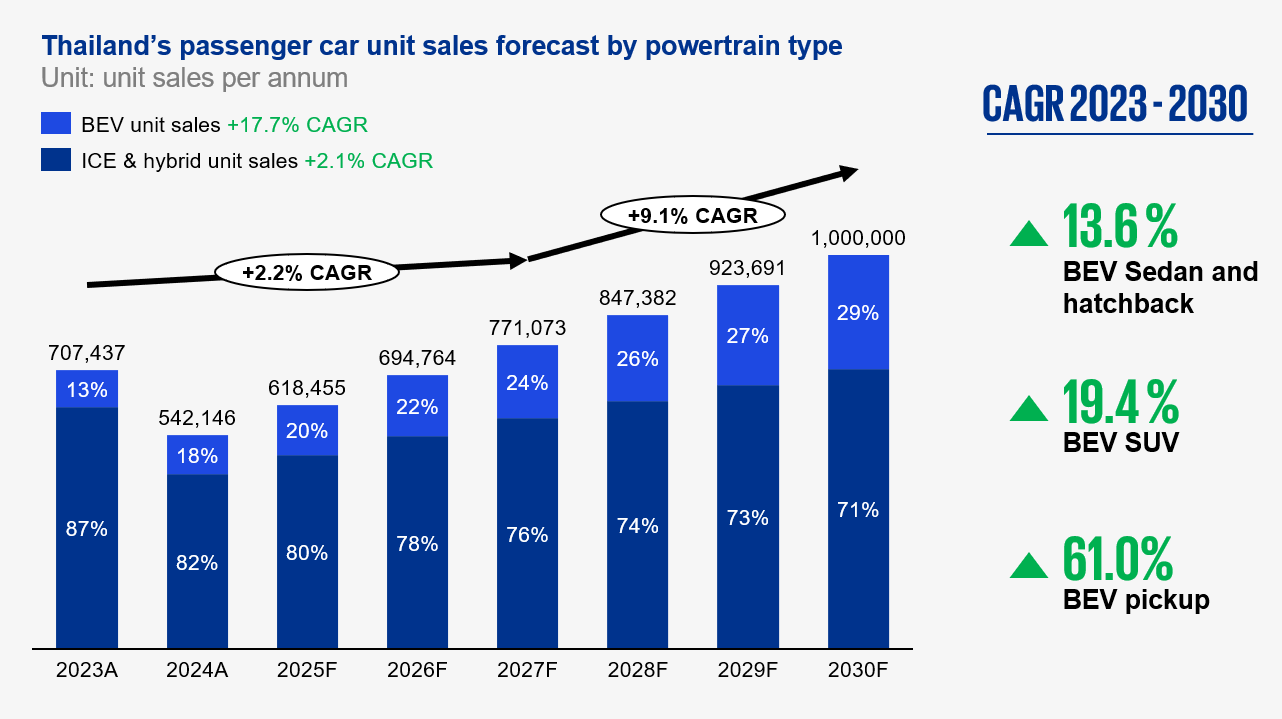 It is expected that the number of battery electric vehicle (BEV) sales will grow at a compound annual growth rate (CAGR) of 17.7%, from 92,576 units in 2023 to 290,000 units by 2030, representing around 29% of total car sales by 2030. Sport utility vehicles (SUVs) are anticipated to be most popular due to their versatility in usage, popularity as primary family vehicles and their adaptability to Thailand's geographical terrain, followed by sedan and hatchbacks. Hatchbacks have also been growing in popularity among consumers due to their compact size and relatively lower entry price points.