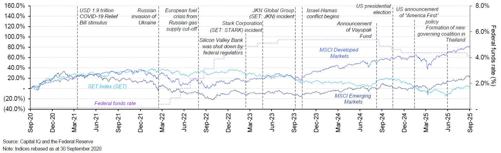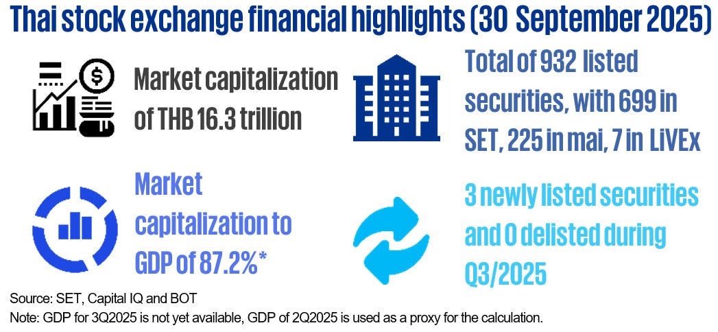 - The Thai capital market (SET Index) has rebounded from its low point in the second quarter, supported by a partial stabilization of global trade policies and domestic political conditions. However, concerns persist regarding the weakening global economic outlook and the slowdown in economic growth during the second half of 2025, driven by the front-loading of exports earlier in the year.