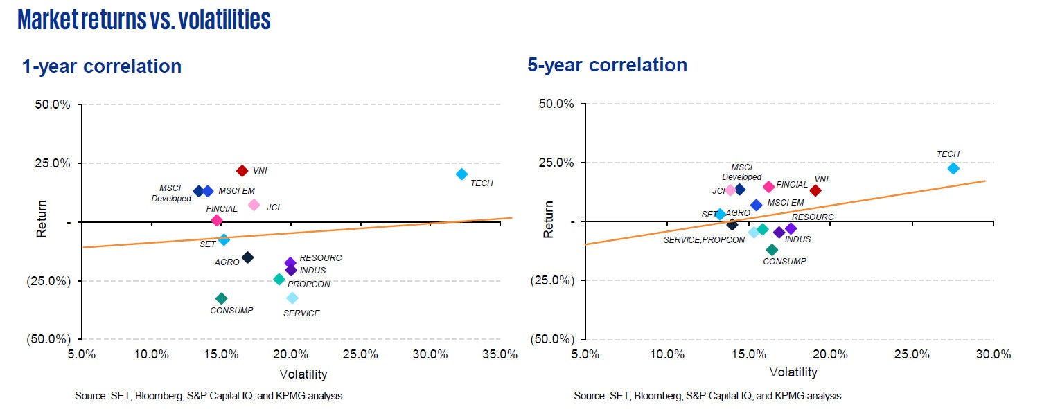 - Over both the one-year and five-year evaluation periods, the SET has continued to deliver lower returns compared to other indices. In Thailand, the TECH sector remains the top performer across both timeframes, whereas the SERVICE and COMSUMP sectors have delivered some of the lowest returns. The FINCIAL sector has reported positive one-year annualized returns for the first time this year.