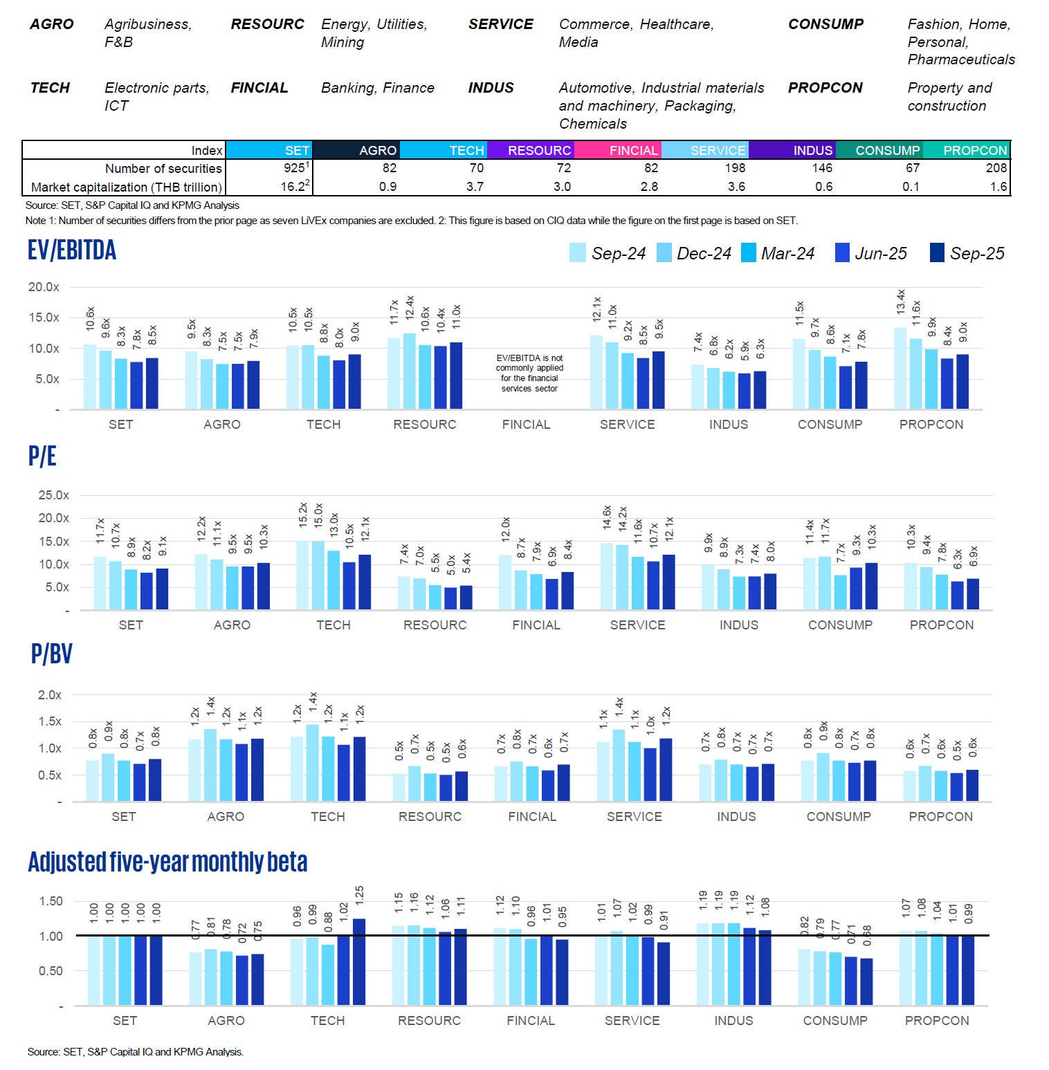 SET valuation metrics by sector (last five quarters)