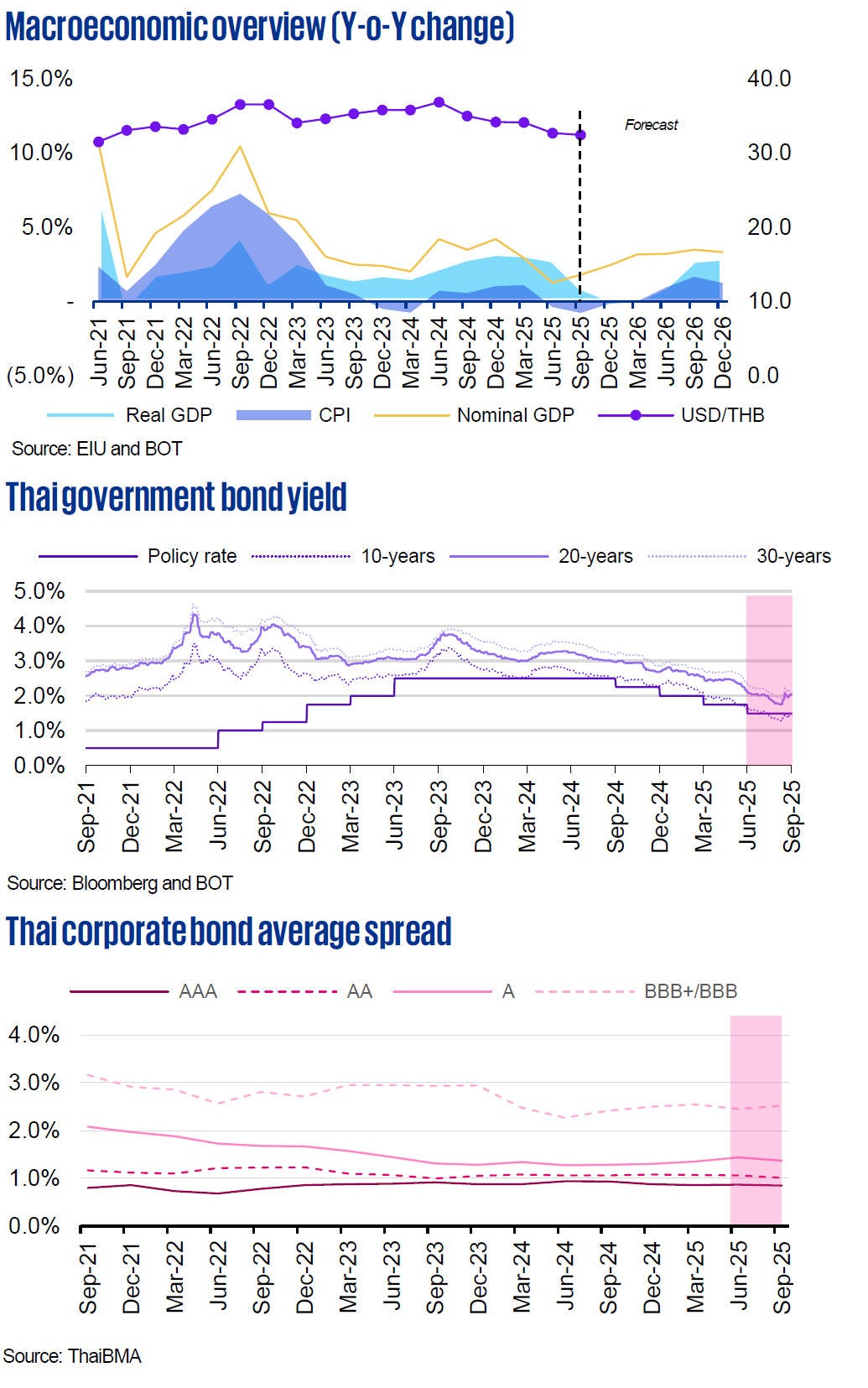 - In October, the Monetary Policy Committee (MPC) forecasted Thailand's GDP to grow by 2.2% in 2025 and 1.6% in 2026, maintaining projections largely consistent with previous assessments. Private consumption is anticipated to weaken, particularly in non-essential goods and services. However, government stimulus measures introduced toward the end of 2025 are expected to offer some support to the economy.