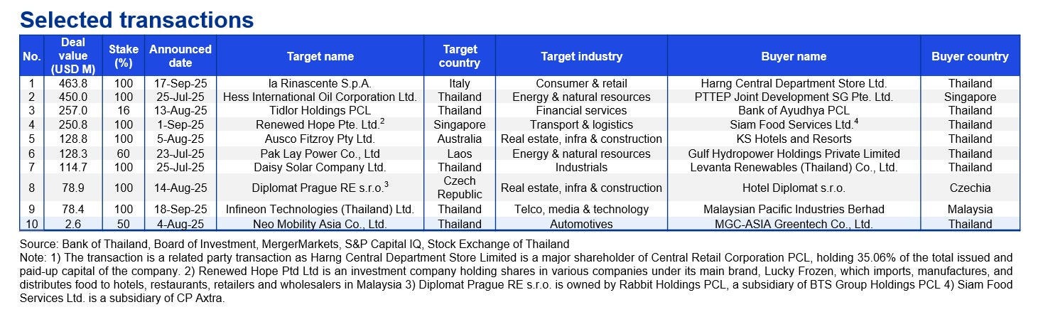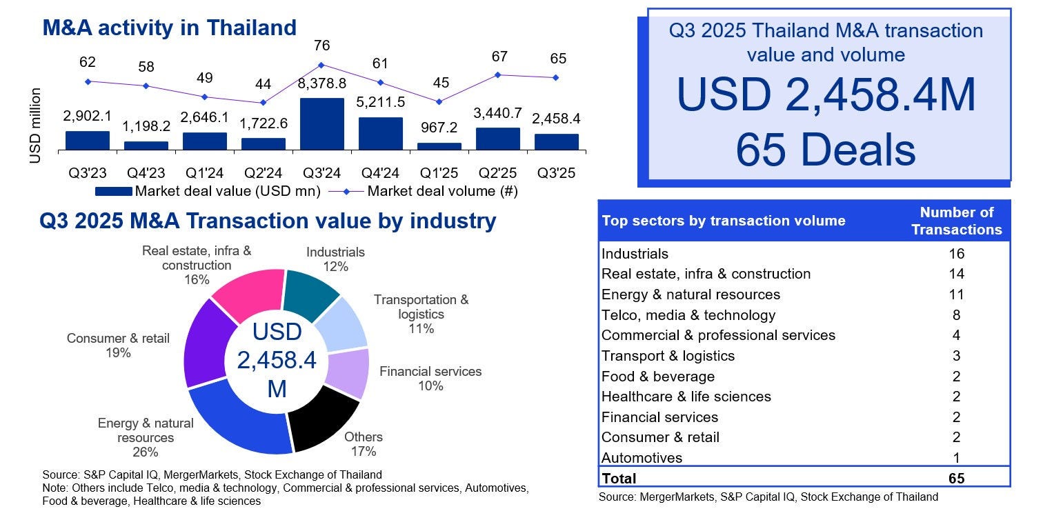 Overall, the economic outlook remains cautious yet poised for selective upside, with the BoT maintaining the policy rate at 1.5% and emphasizing that previous rate cuts are still working their way through the economy. Globally, weakened manufacturing activity in Europe and sluggish demand in the global oil market point to an uncertain outlook for global economic activity. When combined with current domestic trends, these factors may signal a potential slowdown in overall deal activity in Thailand and internationally.