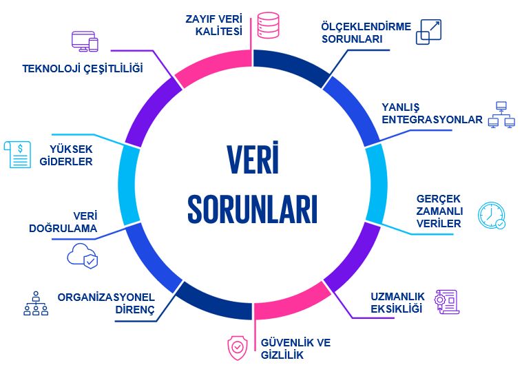 Veriye kolay erişim, güvenilirlik ve veri kalitesini sağlamak, hızlı analiz yapabilmek ve güvenilir ölçütlerle çalışmak, kurumsal hedeflere ulaşmada kritik bir rol oynar. Organizasyonel uyum, çalışanların veri okuryazarlığını artırmak ve etkili bir veri kültürü oluşturmak ise sürdürülebilir başarıya ulaşmanın temel taşlarıdır. Fakat bu hedeflere ulaşabilmekte bir takım zorluklar bizleri karşılayabilir.