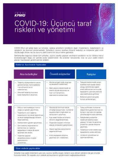 KPMG Sermaye ve Borç Danışmanlığı ekibi olarak sizler için hazırladığımız, şirketlerin Covid-19 sürecini iyi yönetebilmeleri adına dikkat etmeleri gereken konuları özetleyen çalışmalardan üçüncüsü olan “COVID-19: Üçüncü taraf riskleri ve yönetimi” başlıklı çalışmayı sizlerle paylaşıyoruz.