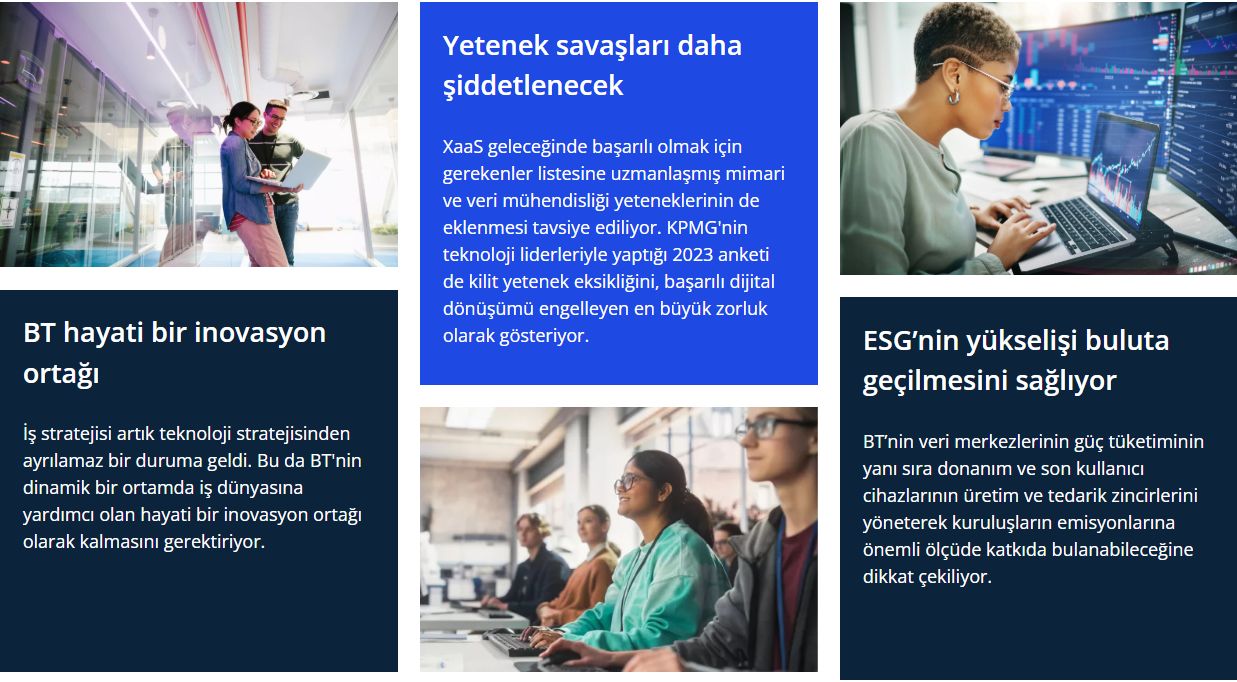 BT'nin yenilikçi, esnek, sürdürülebilir, veri odaklı kuruluşlar oluşturmak için teknolojinin başarılı bir şekilde entegrasyonu ve uygulanmasının arkasındaki itici güç olabileceğine dikkat çeken KPMG tarafından hazırlanan “BT’nin Geleceği” 2024 yılı raporunda altı trendin üzerinde durarak BT'nin geleceğin dijital organizasyonlarını nasıl şekillendirebileceğini de dair önemli bilgiler veriliyor.