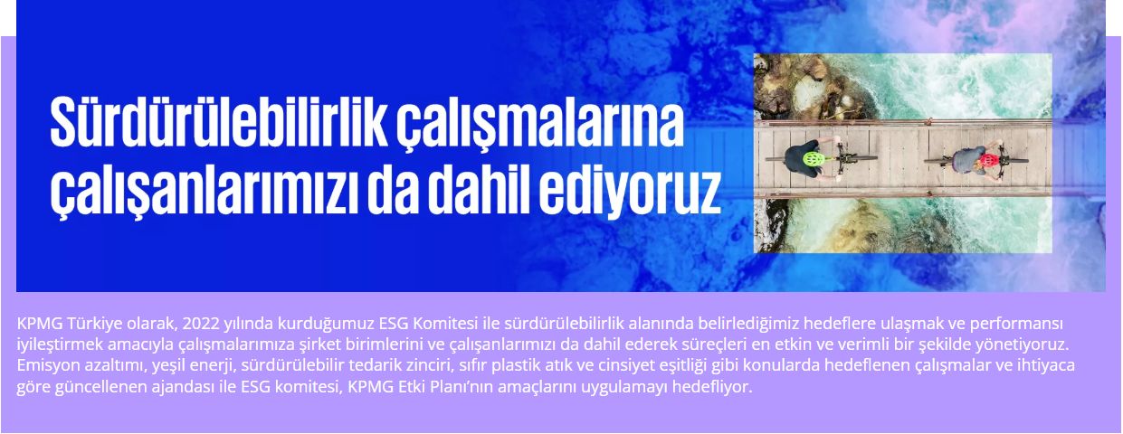 KPMG Türkiye olarak paydaşlarımız için hazırladığımız ikinci Sürdürülebilirlik Raporumuzda, sürdürülebilirlik stratejimiz çerçevesinde yeşil dönüşüm, kadın çalışan ve eğitim konularında yaptığımız çalışmalarımızı sizlerle paylaşıyoruz.