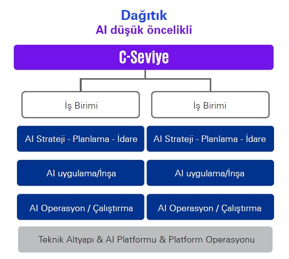 Şirketinizde yapay zekayı (AI) en etkili şekilde kullanmak için öncelikle stratejinizle birlikte işletim modeline ve ayrıntılarına odaklanmanız gerekir. Modellerin organizasyon yapısı dinamikleri ile uyumlu hale getirilmesi için ince ayar yapılması gerekirken, yaygın yaklaşımlar Dağıtık, Strateji Merkezli (Yarı Merkezi) ve Merkezi modelleri içermektedir.