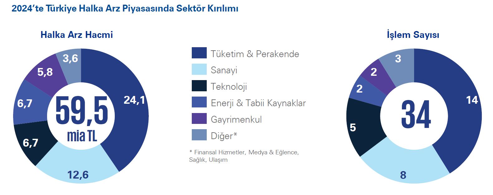 Türkiye’de 2024 yılında toplamda 59,5 milyar TL’lik halka arz hacmine ulaşan piyasada, 24,1 milyar TL’lik hacim ve 14 işlemle tüketim ve perakende sektörü hem işlem hacmi hem de işlem sayısı bakımından birinci sırada yer aldı. Bunu, sanayi (12,6 milyar TL hacim ve 8 işlem) ve teknoloji (6,7 milyar TL hacim ve 5 işlem) sektörleri takip etti.