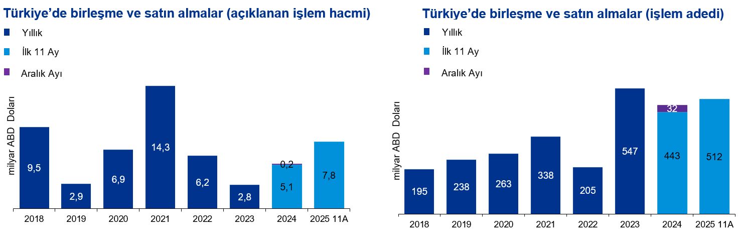 İlk 11 aylık performans, Türkiye'de birleşme ve satın alma aktivitelerinin 2025 yılında işlem hacmi ve adedi bazında bir önceki yıla kıyasla ciddi bir artış gösterdiğine işaret ediyor