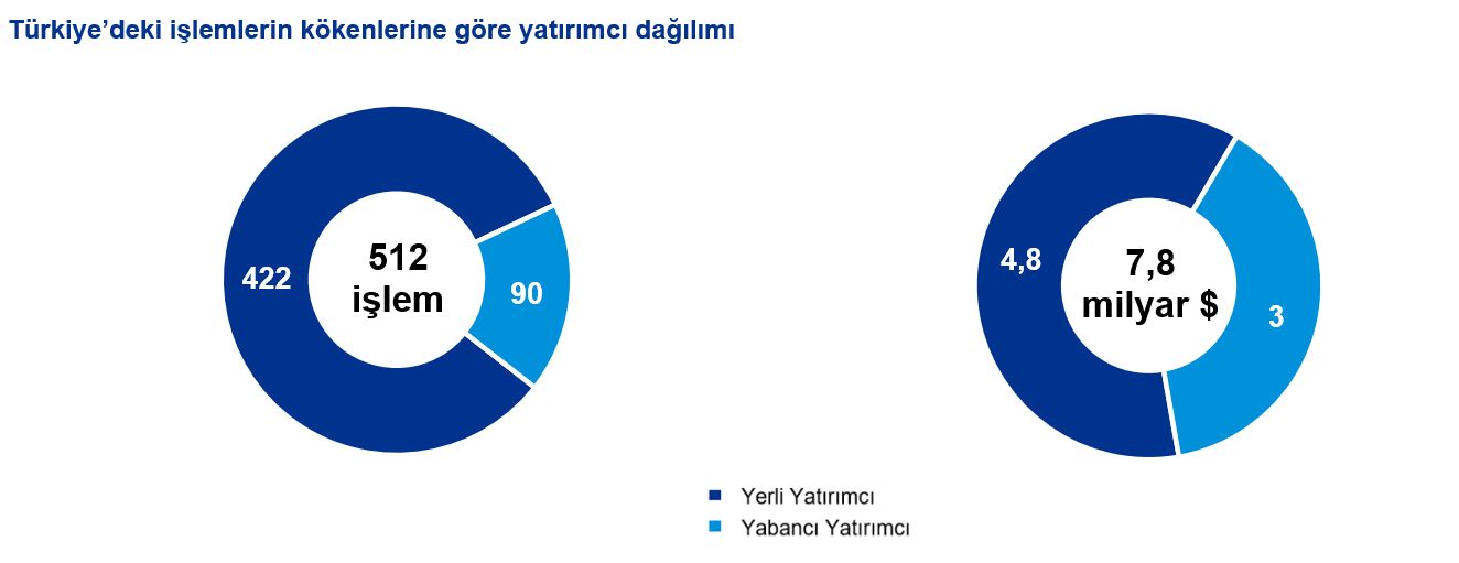 2025 yılının ilk 11 ayında yabancı yatırımcılar, toplam 3 milyar dolar değerinde 90 işlem gerçekleştirdi. Bu işlem adedi bazında toplam işlemlerin yüzde 18’ini oluştururken, işlem hacmi bazında ise açıklanan işlemlerin yüzde 39’una tekabül ediyor ve geçen yılın aynı dönemine kıyasla işlem hacminde artışa işaret ederken yabancı yatırımcıların geçmiş dönemde de olduğu gibi daha büyük ölçekli satın alımlara ilgi gösterdiğinin bir kanıtı olarak öne çıkıyor.