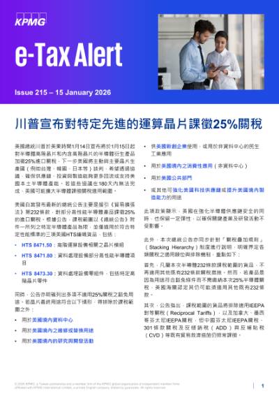美國總統川普於美東時間1月14日宣布將於1月15日起對半導體高階晶片和內含高階晶片的半導體衍生產品加徵25%進口關稅,下一步美國將主動與主要晶片生產國(例如台灣、韓國、日本等)談判,希望透過協議,確保供應鏈、投資與製造能夠更多回流或支持美國本土半導體產能。若這些協議在180天內無法完成,美國可能擴大半導體課徵關稅適用範圍。